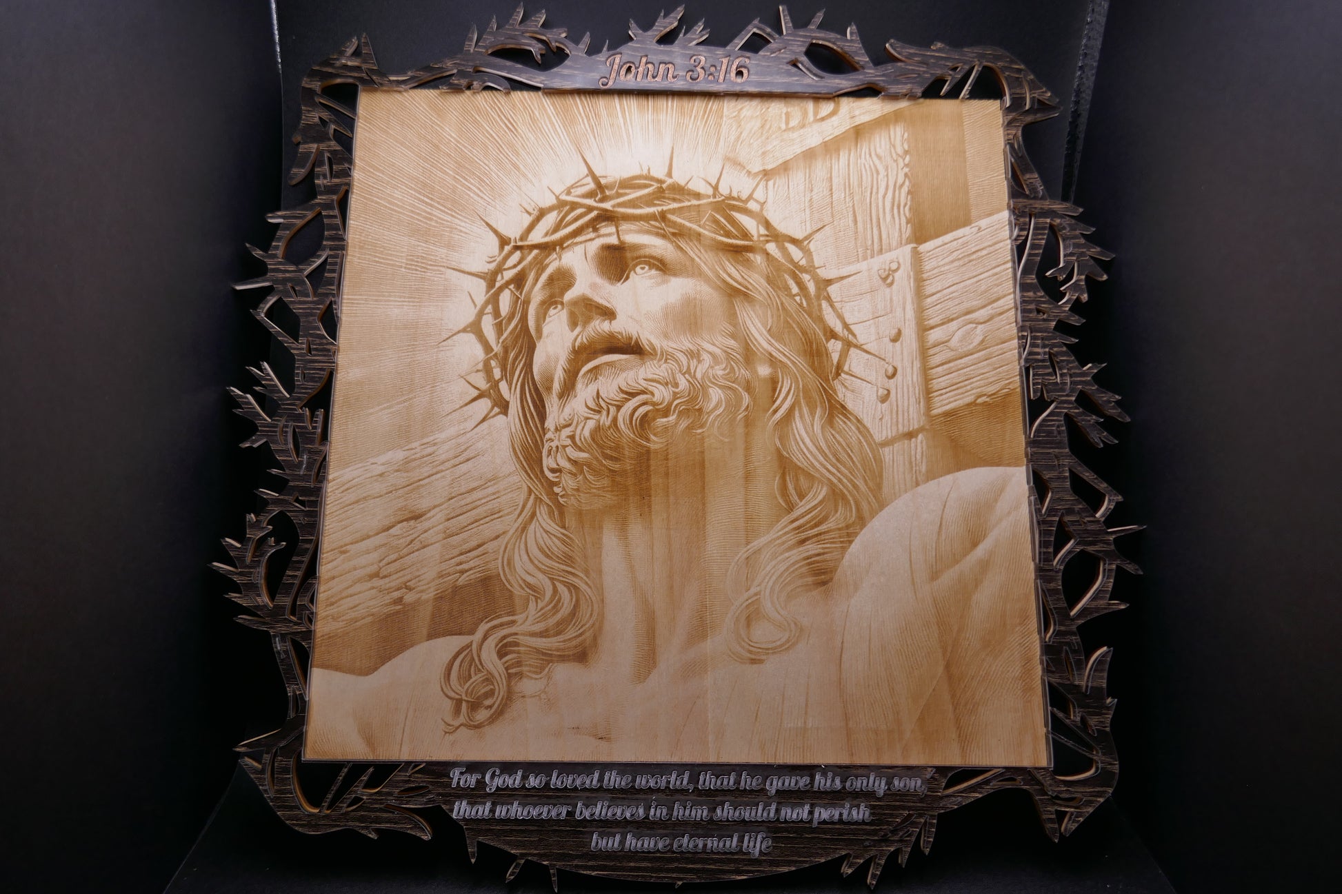 Honor your faith with this beautifully laser-engraved depiction of Jesus Christ on the cross, paired with the powerful words of John 3:16 or a personalized verse of your choice.