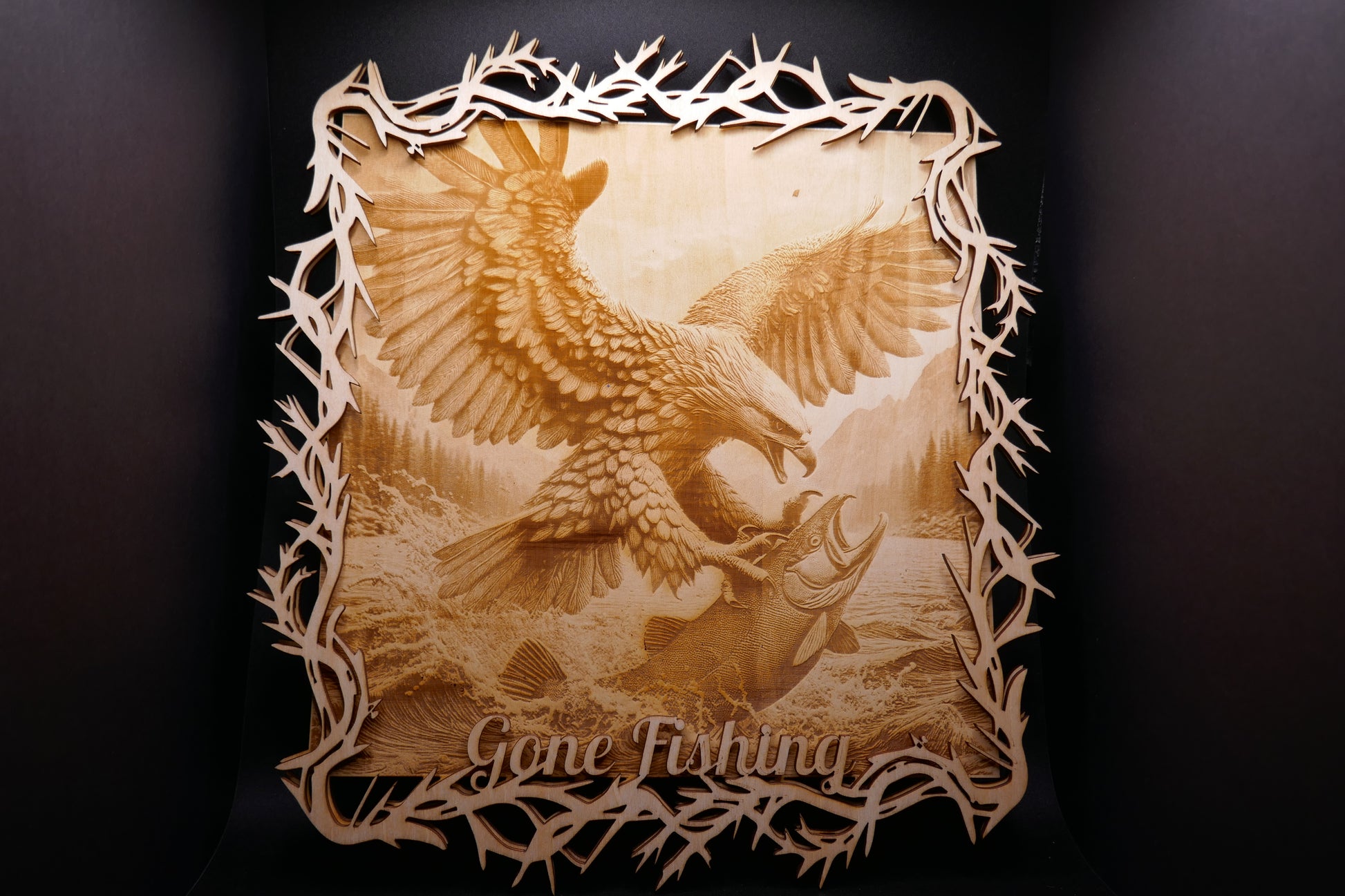 - Precision Engraving: Every feather, ripple of water, and gleam of the salmon is brought to life with razor-sharp detail, thanks to state-of-the-art laser engraving technology.