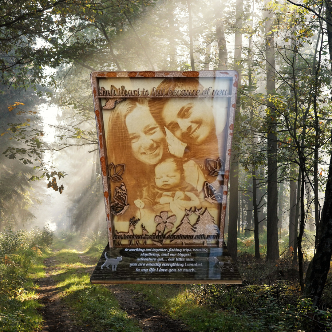 Celebrate the ones you love with a custom laser-engraved portrait, crafted with precision and framed with laser-carved designs and a sleek acrylic covering for an elegant, modern touch.